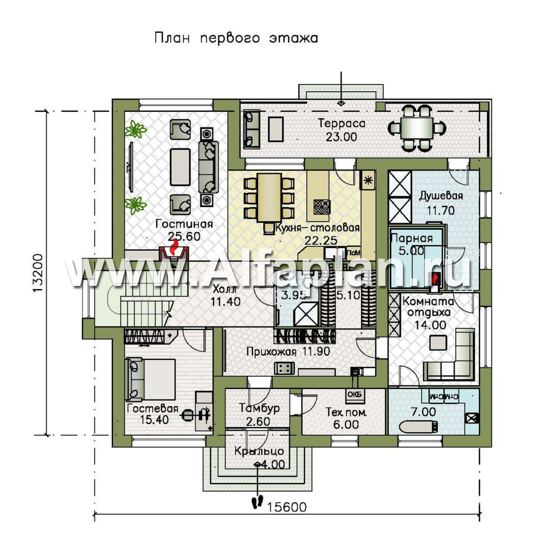 Далее из прихожей выход в холл с лестницей на второй этаж. Из холла можно пройти в кабинет 15 м², войти в кухню-столовую с выходом на открытую террасу 13 м² или в гостиную с камином и эркером.