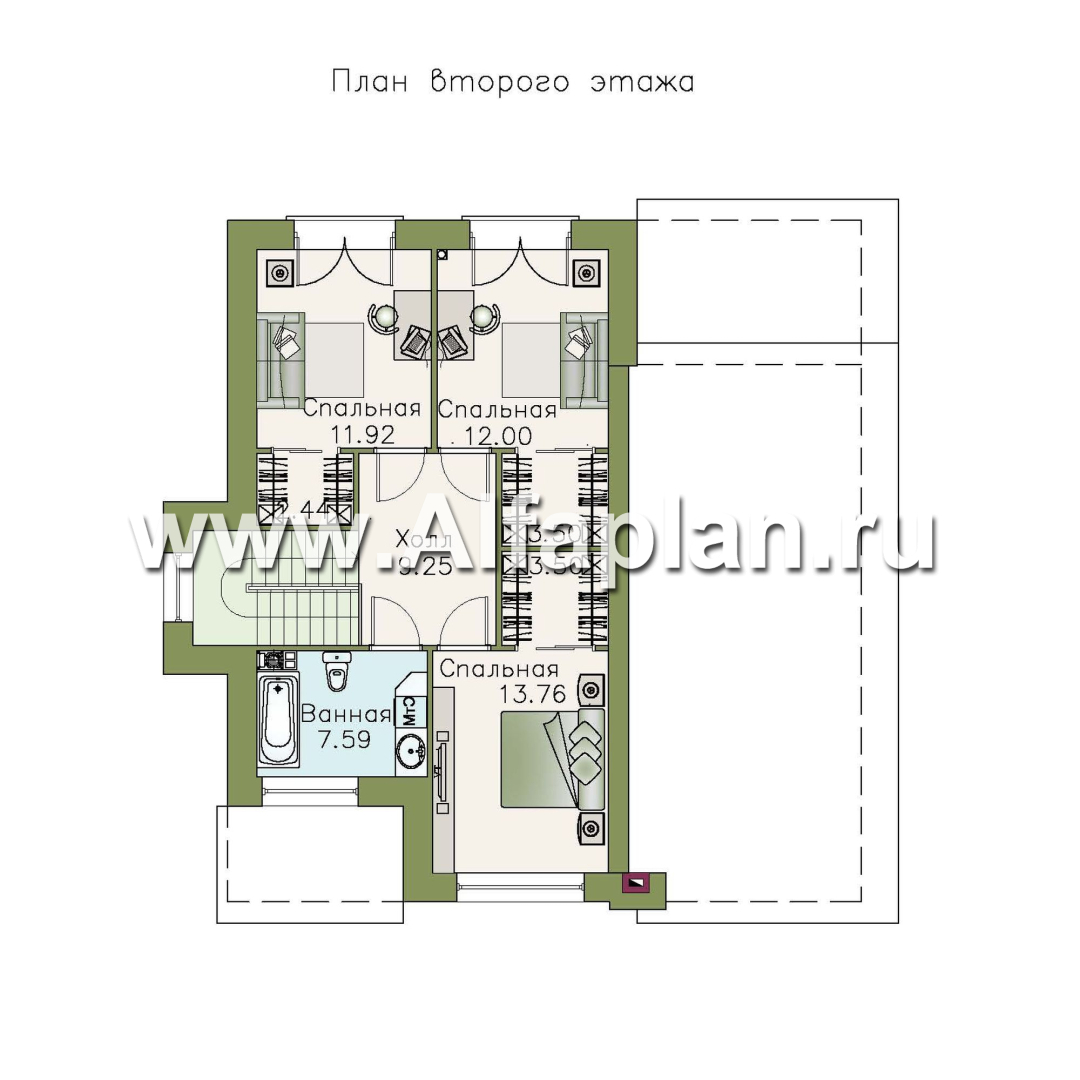 Второй этаж этого проекта коттеджа в основном отдан под помещения приватной группы: это три спальни, одна из которых является изолированной. Все они сосредоточены вокруг прямоугольного холла, занимающего центральное пространство этажа.