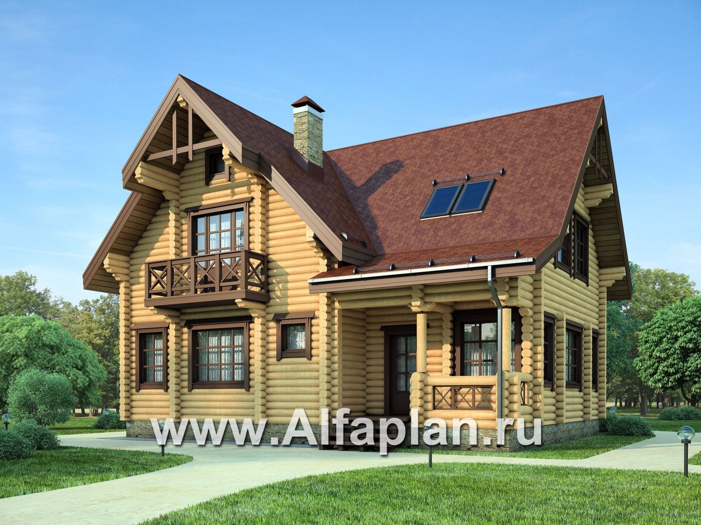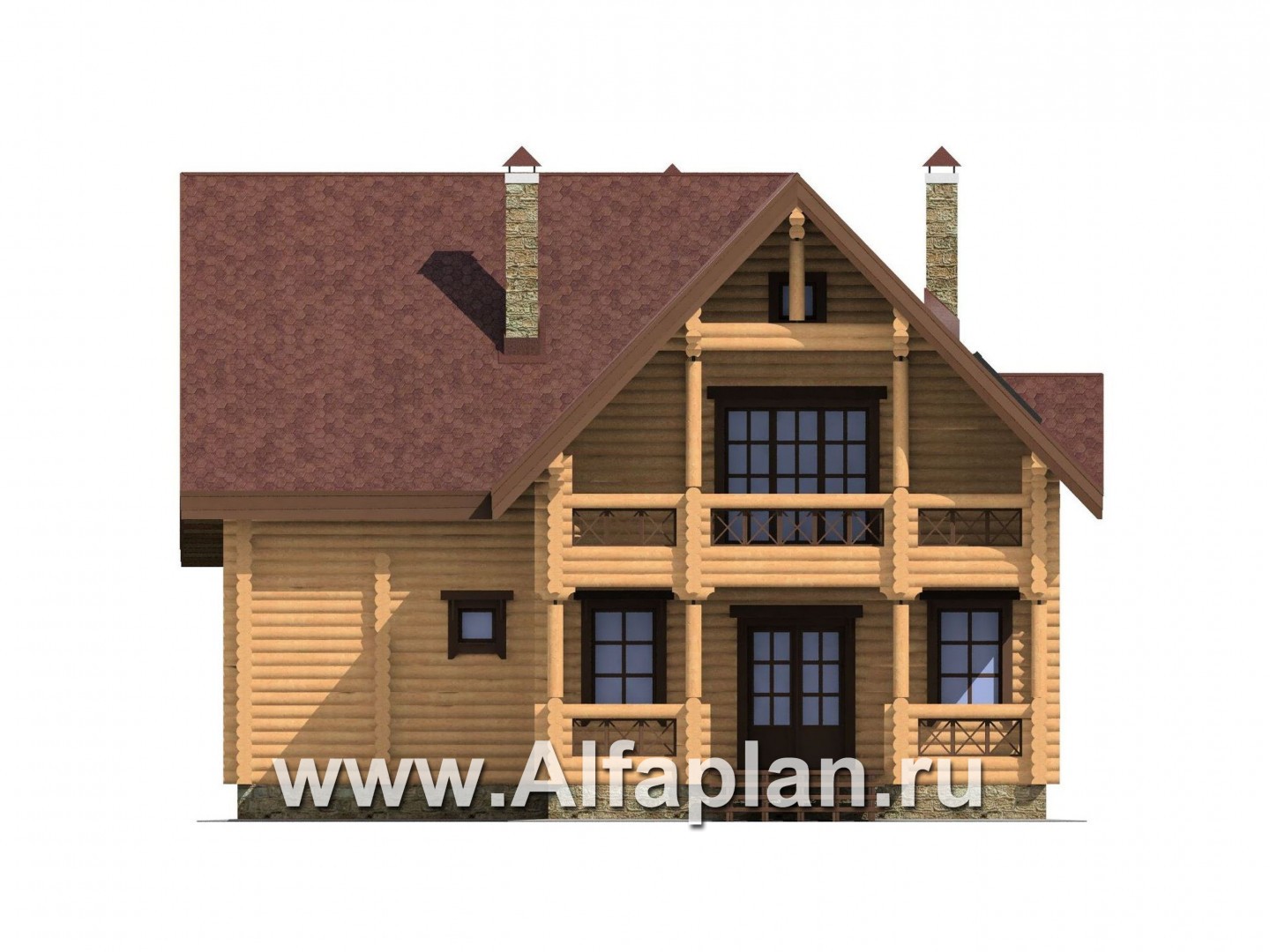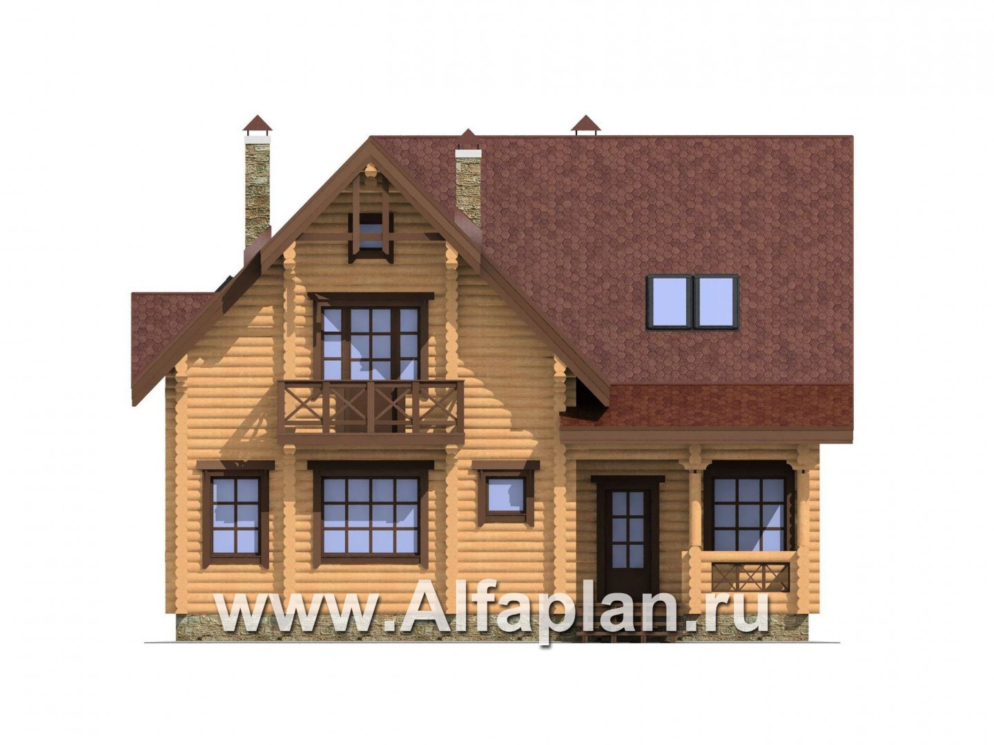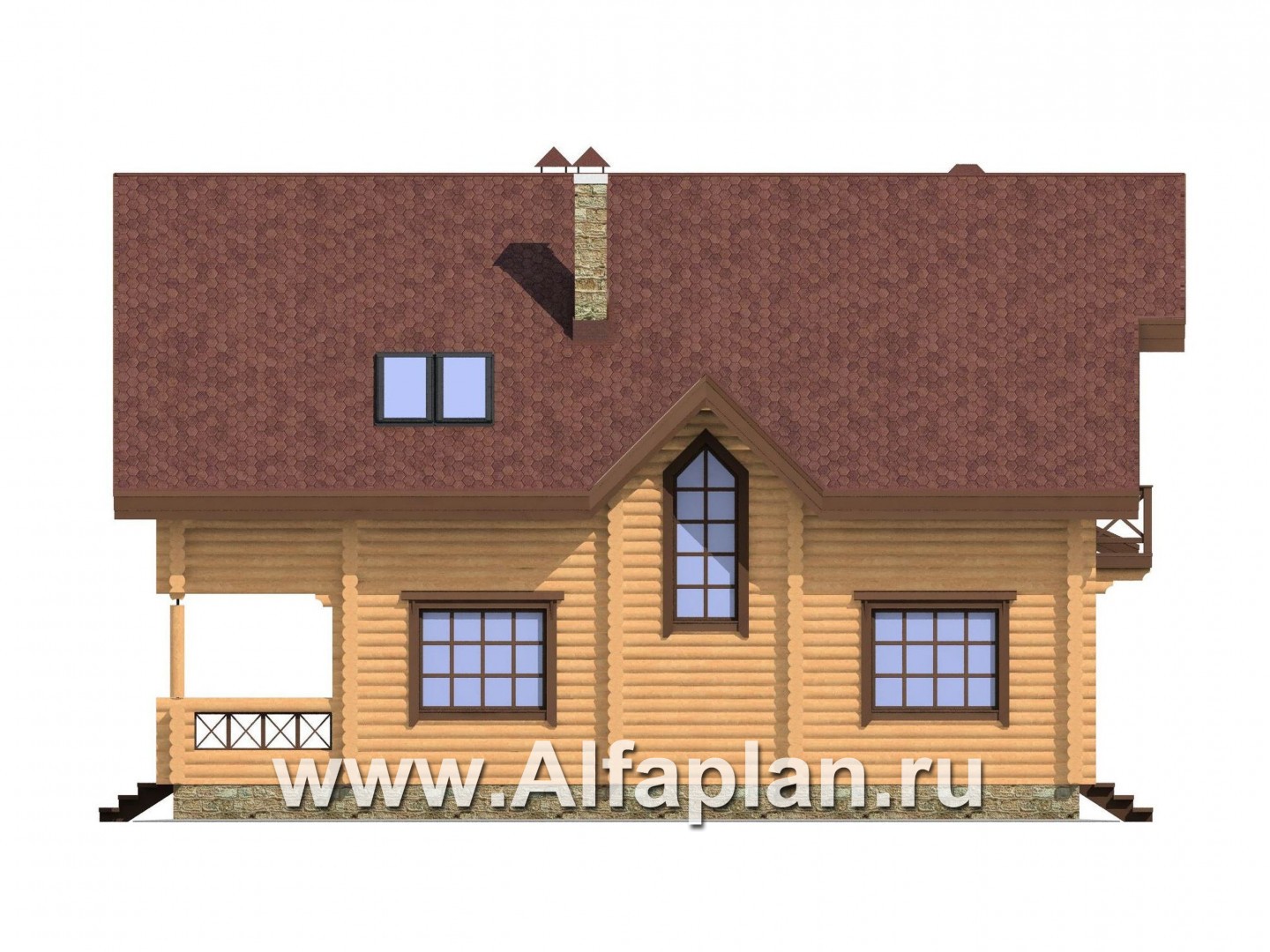 Проект деревянного дома с мансардой, из бревен, с верандой